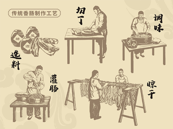 北魏·贾思勰《齐民要术》—灌肠法:“取羊盘肠,净洗治。细锉羊肉,令如笼肉,细切葱白、盐、豉汁、姜、椒末调和,令咸淡适口,以灌肠。两条夹而炙之。割食甚香美。”这是有据可查的最早关于香肠工艺的史料记载。