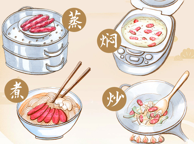 香肠做法多样,烹饪简单,是家家户户厨房中一年到头不可缺少的食材。第一种:整根香肠隔水蒸或水煮15分钟,品尝原汁原味;第二种:搭配各类时蔬炒着吃,荤素搭配有营养;第三种:搭配米饭、米线、面条,简单美味又快手。